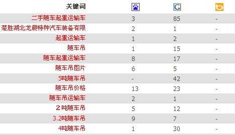 隨車吊專業(yè)網(wǎng)站:我是楚勝湖北龍晨特種汽車裝備有限公司的銷售經(jīng)理,主要銷售隨車吊,并且每個人都有網(wǎng)站,有的是在百度上推廣,而我的網(wǎng)站是在百度上優(yōu)化網(wǎng)站,關(guān)鍵詞是隨車起重運(yùn)輸車,隨車吊,起重運(yùn)輸車,二手隨車起重運(yùn)輸車,經(jīng)過一年的努力,網(wǎng)站終于有了起色,先讓大家看看隨車吊網(wǎng)站的收錄情況截圖如下: