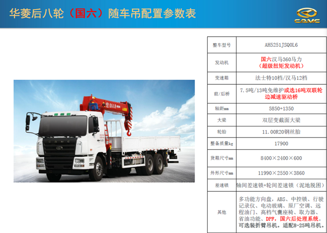 12噸隨車吊配置HN5250P27E8M3JSQ,前面講過<12噸華菱后雙橋隨車吊參數(shù)>,想了解的可以點進去看下,一款隨車吊的配置主要是指發(fā)動機的馬力多大?輪胎型號?變速箱是什么型號及品牌?等等,這里也來為客戶說下12噸華菱后雙橋隨車吊配置: