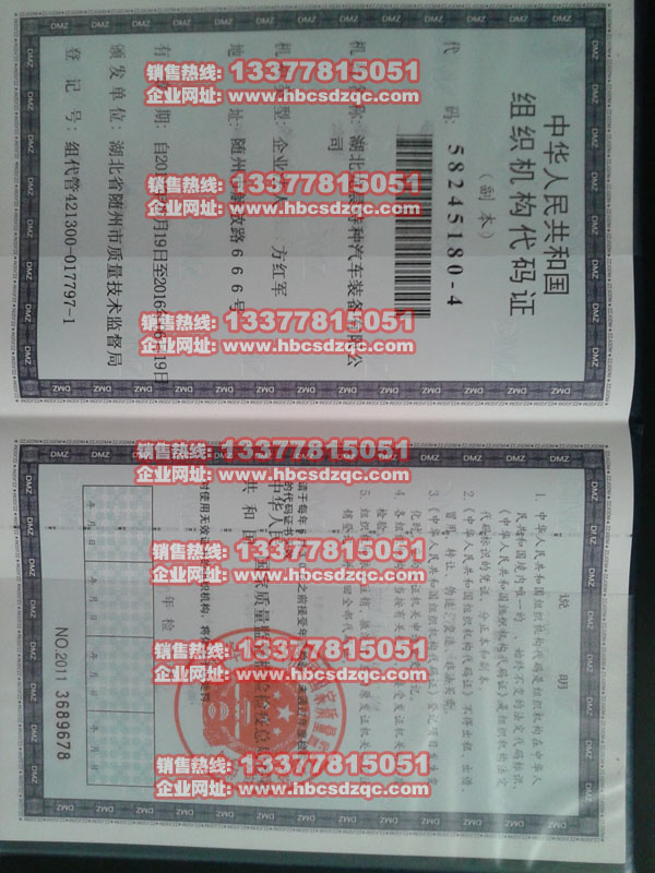 湖北龍晨特種汽車裝備有限公司中國人民共和國組織機(jī)構(gòu)代碼證掃描件: