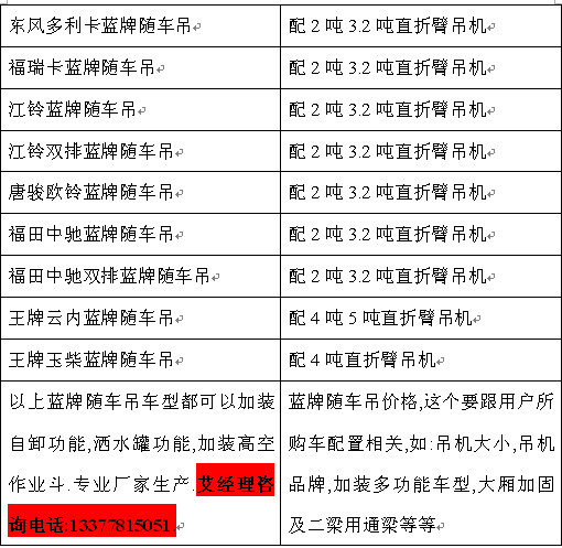 國Ⅴ藍(lán)牌隨車吊價(jià)格表也可以叫C證可駕駛的隨車吊,其品牌有東風(fēng)多利卡藍(lán)牌隨車吊,福瑞卡藍(lán)牌隨車吊,王牌藍(lán)牌隨車吊,唐駿歐鈴藍(lán)牌隨車吊,江鈴藍(lán)牌隨車吊,福田中馳藍(lán)牌隨車吊,藍(lán)牌隨車吊價(jià)格這是個(gè)很敏感的詞,作為一名買車的用戶最關(guān)心的問題,又想買到最好品牌藍(lán)牌隨車吊,又想買到最便宜藍(lán)牌隨車吊,專業(yè)起重運(yùn)輸車銷售艾經(jīng)理告訴廣大用戶,只有到專業(yè)廠家才能買到--湖北程力銷售艾經(jīng)理.