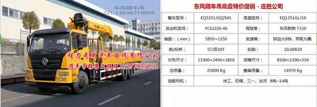 10噸12噸14噸后雙橋東風隨車吊EQ5251JSQZM1型隨車起重運輸車東風后雙橋隨車吊YC6J220-46 :這款東風后雙橋隨車吊的大梁300,1000的鋼絲胎,八檔箱,新款駕駛室,玉柴220國四國五發(fā)動機,8500×2300×550的大廂長度,可以在大廂里加個相應的水罐。