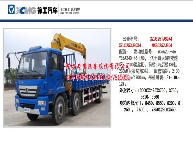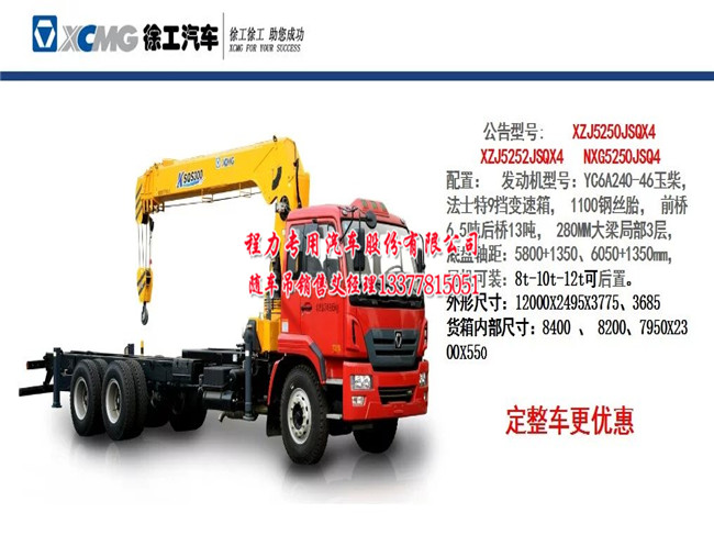 徐工牌NXG5252JSQ4型隨車起重運(yùn)輸車,YC6A240-46 8550×2300×550 12000×2495×3760自重12980法士特大8檔變速箱,1000鋼絲胎,前橋5噸后橋13噸,280的大梁局部三層,一般配8噸10噸12噸折直臂吊機(jī)。