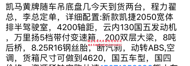 6.3噸5噸國(guó)五排放凱馬隨車吊,是最新款凱巴捷2050寬體排半駕駛室,整車寬度不超過(guò)2.25米,適合鄉(xiāng)村公路跑,總質(zhì)量(Kg)9995,額定載質(zhì)量(Kg) 3340,整備質(zhì)量(Kg)6460,凱馬牌KMC5102JSQA42P5型隨車起重運(yùn)輸車,底盤型號(hào) KMC1102A42P5,排放標(biāo)準(zhǔn) GB17691-2005國(guó)Ⅴ,GB3847-2005,4200軸距,國(guó)五隨車吊國(guó)五排放云內(nèi)130馬力發(fā)動(dòng)機(jī),萬(wàn)里揚(yáng)5檔帶副變速箱,200的雙層大梁,8噸的后橋,825R16鋼絲胎,斷汽剎,動(dòng)轉(zhuǎn),ABS,有空調(diào),貨廂4620×2100×550,也可以配多功能隨車吊帶自卸帶灑水帶工作斗帶清障等等。