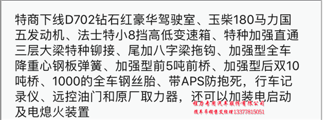 東風(fēng)特商隨車吊配置:東風(fēng)牌EQ5166JSQF型隨車起重運(yùn)輸車EQ5166JSQFVJ(4×2)東風(fēng)特商164000.00玉柴YC6J180-52發(fā)動機(jī)國五排放國五隨車吊,陜齒小八檔8JS85E變速箱、帶取力器,5噸前橋10噸后橋,300mm通三層,10.00R20鋼絲胎,帶動轉(zhuǎn)、排氣制動、斷氣剎,帶ABS和下防護(hù)。D913新款豪華排半駕駛室。隨車吊價(jià)格與用戶要求有直接關(guān)系。