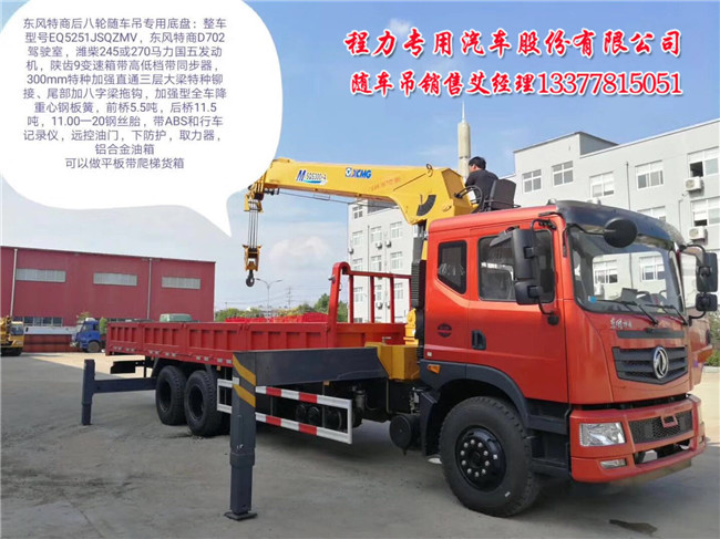 12噸10噸14噸東風(fēng)特商后雙橋隨車吊整車型號:EQ5251JSQZMV-東風(fēng)D702新款駕駛室. 濰柴245馬力(濰柴270馬力、YC6A240-50) 陜齒9JS119變速箱,300MM三層直通大梁.前加強(qiáng)型前5.5噸,后雙加強(qiáng)11.5噸(可選13噸后橋), 11.00全車鋼絲輪胎,原裝取力器。帶ABS和行車記錄儀. 遠(yuǎn)控油門 .專用隨車起重機(jī)底盤。此底盤可以做隨車吊平板帶爬梯。
