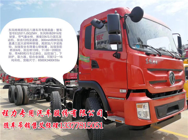 8噸10噸玉柴180馬力兩軸東風(fēng)特商隨車吊整車型號:EQ5166JSQZMV-國五隨車吊特商單橋EQ1166GFJ1,東風(fēng)D702新款駕駛室. 陜齒9JS119變速箱,YC6J180-52、300MM三層直通大梁.前加強(qiáng)型前5.5噸,后雙加強(qiáng)11.5/13噸, 11.00全車鋼絲輪胎,原裝取力器。帶ABS和行車記錄儀. 遠(yuǎn)控油門 .專用隨車起重機(jī)底盤。此底盤可以做隨車吊平板帶爬梯。6100*2400*550、5800*2400*550。