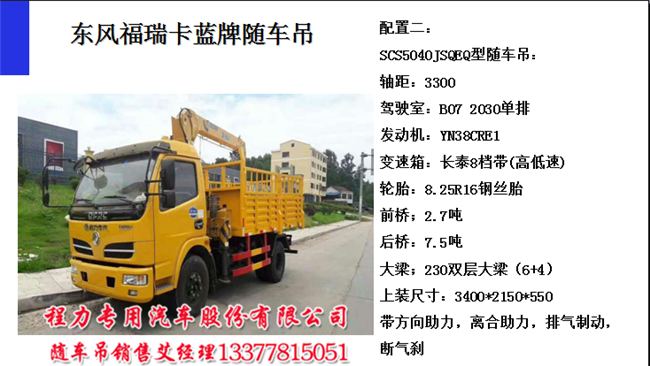 拉12噸貨藍牌隨車吊選東風福瑞卡藍牌隨車起重運輸車簡介:主要從車廂尺寸、發(fā)動機馬車、輪胎型號等等了解:隨車起重運輸車產(chǎn)品型號 SCS5040JSQEQ整車參數(shù)