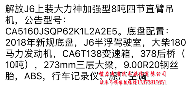 J6解放隨車吊吊機可配8噸6.3噸5噸4噸直折臂