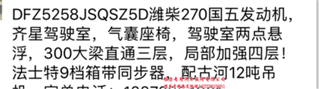 濰柴270馬力東風后雙橋隨車吊齊星駕駛室后雙橋隨車吊標配12噸吊機,鋁合金儲氣罐,帶ABS,帶動力轉(zhuǎn),斷氣剎,D913車身豪華內(nèi)飾,電動玻璃,法斯特9檔變速箱,車架300mm雙層(局部三層)直通大梁, 5T前橋/ 10T雙后橋,加厚鋼板,11.00R20鋼絲胎.