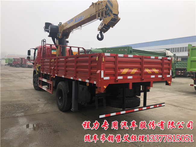 隨底盤選裝前圍、側圍、前保險杠(包括前部燈具)及車門覆蓋件.選裝箱板結構.選裝上/中座椅操作.直臂式吊機:型號/吊機質量(kg)/最大起升載荷(kg)分別為:SQS125,SQS157,SPS16000,URV500,URV630/2250/5000.防護欄材料材質:側護欄和后護欄材料材質都為Q235;連接方式:側護欄和后護欄連接方式都為螺栓連接;后防護斷面尺寸:50mm×100mm;后防護離地高度:480mm.安裝具有衛(wèi)星定位功能的行駛記錄儀.ABS系統(tǒng)生產廠家:東風電子科技股份有限公司汽車制動系統(tǒng)公司