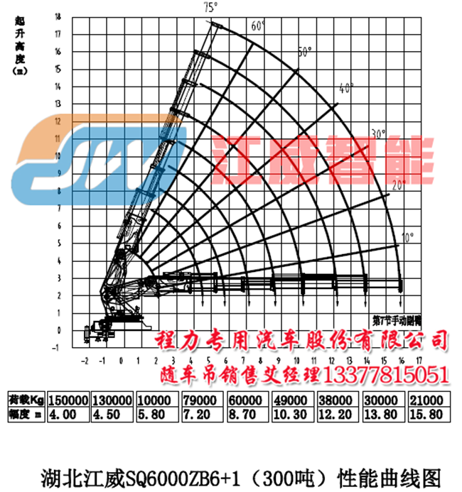 SQ600大噸位折臂江威隨車吊性能曲線圖,工作半徑15.5米,舉升高度18.5米左右,在2米吊300噸,4米吊150噸,5.8米吊100噸,8.7米吊60噸,12米吊38噸,15.5米吊21噸,SQ6000ZB6+1江威隨車吊,是六節(jié)申縮臂加一節(jié)手動臂,整車高度3.5米,回轉(zhuǎn)速度(轉(zhuǎn))大于等于2.5,額定工作壓力30MPa.支腿跨度2500-8100mm .