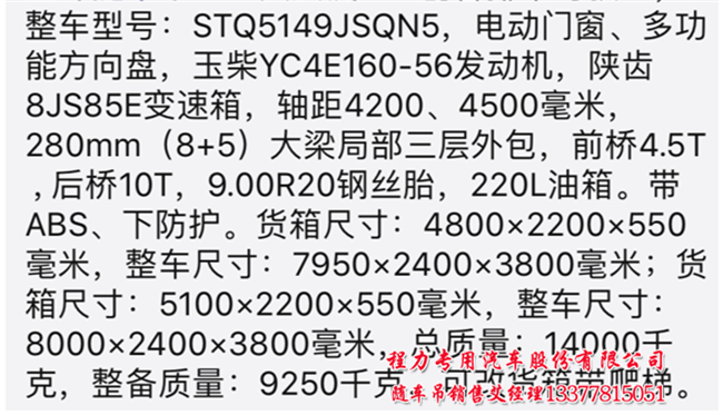 十通153縮短橋隨車起重運(yùn)輸車軸距為:后橋153縮短4200/4500(160馬力)T3創(chuàng)客排半駕駛室,電動(dòng)門(mén)窗、多功能方向盤(pán),玉柴YC4E160-56發(fā)動(dòng)機(jī),陜齒8JS85E變速箱,280mm(8+5)大梁局部三層外包,前橋151,后橋153縮短,9.00R20鋼絲胎,220L鋁合金油箱。帶ABS、下防護(hù)。貨箱可帶爬梯