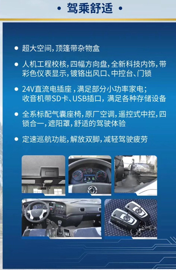 東風(fēng)華神F5隨車吊駕乘舒適:超大空間,頂篷帶雜物盒,人機(jī)工程校核,四幅方向盤,全新科技內(nèi)飾,帶彩色儀表顯示,鍍鉻出風(fēng)口,中控臺,門鎖.24V直流電插座,滿足部分小功率家電.收音機(jī)帶SD卡,USB插口,滿足各種存儲設(shè)備.全系標(biāo)配氣囊座椅,有空調(diào),遙控式中控,四鎖合一,遮陽罩,舒適的駕駛體驗.定速巡航功能,解放雙腳,減輕駕駛疲勞.