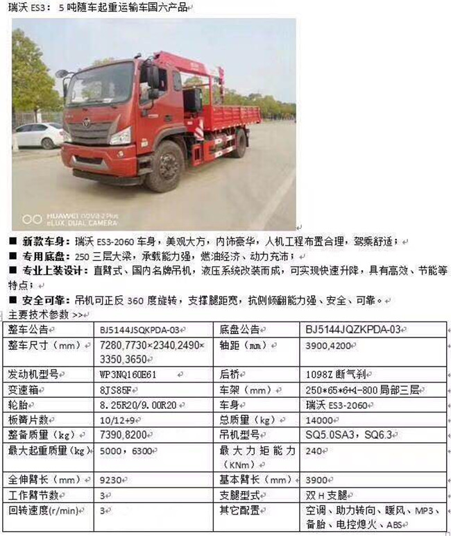 BJ5144JSQKPDA-03國六6.3噸5噸福田瑞沃隨車吊配置福田瑞沃ES3寬體豪華車身,濰柴160馬力,法士特8檔,三層大梁 ,9噸后橋,8.25R20輪胎,動轉(zhuǎn),ABS,電動玻璃門窗,中控,遙控鑰匙,定速巡航,原廠空調(diào),遠程終端監(jiān)控
