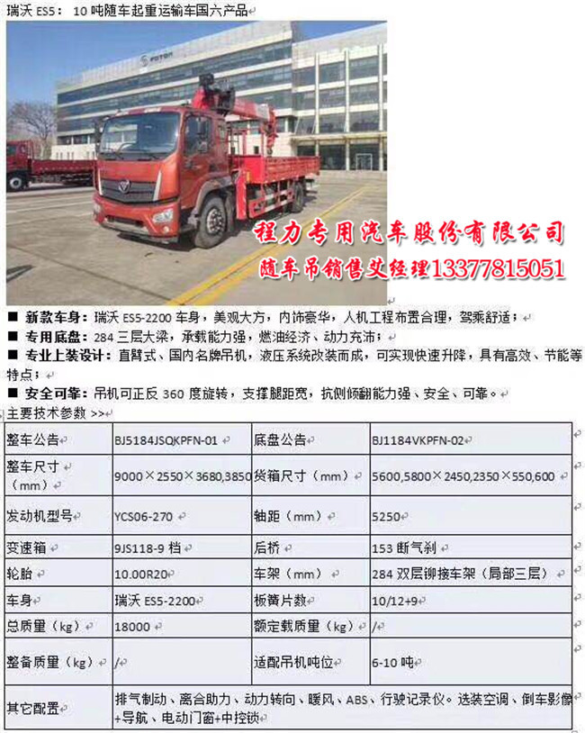 8噸福田瑞沃國六隨車吊10噸瑞沃隨車吊ES5寬體豪華車身,濰柴220馬力/玉柴270馬務,法士特8檔,三大梁 ,10.00R20輪胎,動轉(zhuǎn),ABS,電動玻璃門窗,中控,遙控鑰匙,定速巡航,原廠空調(diào),遠程終端監(jiān)控