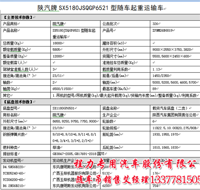 8噸陜汽軒德X6隨車吊國六軒德隨車吊參數(shù):陜汽牌SX5180JSQGP6521型隨車起重運輸車,外形尺寸(mm) 9000×2550×3750,3820,貨廂尺寸(mm)5600×2450×600整備質量(Kg)12000額定載質量(Kg)5805總質量(Kg) 18000最高車速(Km/h)89底盤型號SX1180GP6501發(fā)動機型D4.5NS6B220