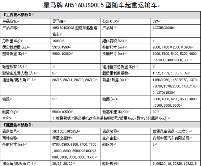 華菱隨車吊參數(shù):主要體現(xiàn)整車長度,貨廂長度,整車自重,行車證噸位,整車總質(zhì)量及軸距等等。星馬牌AH5160JSQ0L5型隨車起重運(yùn)輸車,總質(zhì)量(Kg)16000,額定載質(zhì)量(Kg)5970,4990,外形尺寸(mm) 9000,7400×2500,貨廂尺寸(mm)5600×2300,2400×500,駕駛室準(zhǔn)乘人數(shù)(人) 2,軸距(mm)5600,最高車速(Km/h)98,底盤型號HN1160H19E6M5J,排放標(biāo)準(zhǔn)GB17691-2005國Ⅴ,GB3847-2005YC4EG160-50