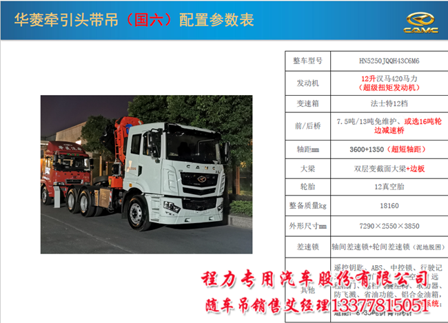 國(guó)六華菱廠家介紹:14噸16噸18噸國(guó)六前四后八隨車吊配置:AH5310華菱,國(guó)六漢馬400馬力,法士特12檔,高強(qiáng)度變截面大梁,前橋7.5噸,后橋13噸,11.00R20鋼絲胎,原廠空調(diào),高檔豪華氣囊座椅,多功能方向盤,取力器,遠(yuǎn)程油門,節(jié)油開關(guān)。華菱重卡新款平頂新內(nèi)飾.漢馬390馬力.