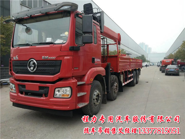 16噸前四后八陜汽德龍隨車吊配置之一: 8X4 M3000加強版.整車型號SX5310JSQHB466.底盤型號SX1310MB6.濰柴WP10.310E53馬力.濰柴WP10.336E53馬力.軸距2100+4575+1400/2200.車廂8400*2450*600.變速箱12JSD159T,前后橋7.5T/MAN16T雙級4.266.輪胎12.00R20.車架866*308(8+5+8).