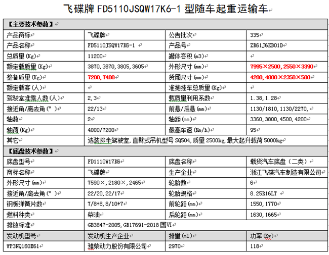 6.3噸7噸奧馳隨車吊公告參數(shù):飛碟牌FD5110JSQW17K6-1型隨車起重運(yùn)輸車,總質(zhì)量(Kg)11200,額定載質(zhì)量(Kg)3870,整備質(zhì)量(Kg)7200,外型尺寸:7000*2400*3390,車箱尺寸:4200*2300*500。軸距(mm)3800,底盤型號(hào)FD1110W17K6,輪胎規(guī)格8.25R16LT 18PR,發(fā)動(dòng)機(jī)型號(hào)WP3NQ160E61。
