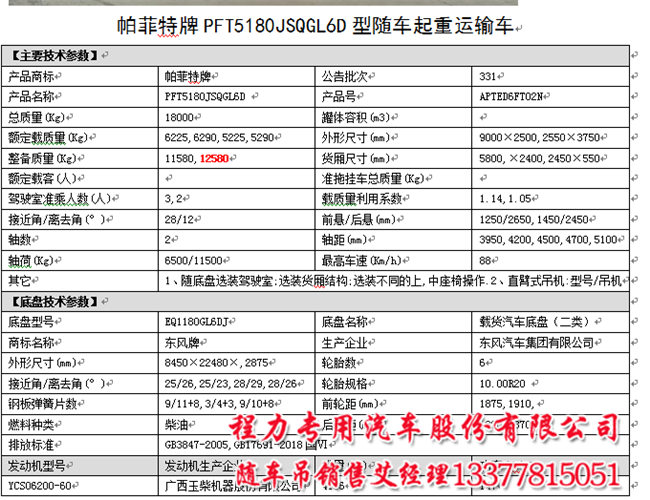 產(chǎn)品名稱 PFT5180JSQGL6D型隨車起重運輸車