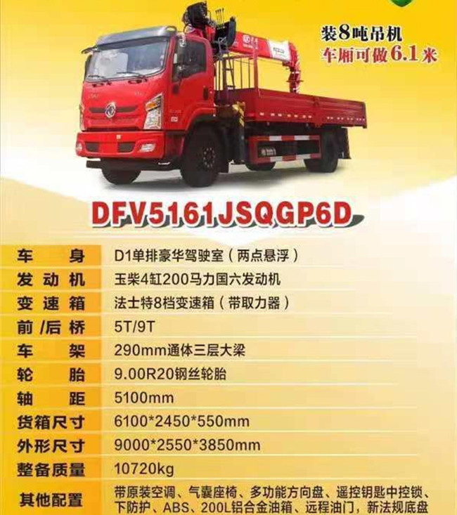 國(guó)六6米1暢行D1隨車吊_6.1米D1隨車吊_單排D1隨車吊_8噸D1隨車吊配置:D1豪華內(nèi)飾駕駛室_法士特小8擋變速箱_氣囊座椅_原廠空調(diào)_290mm通三層專用車架_9.00R20鋼絲胎_ABS_下防護(hù)_多功能方向盤(pán)_四合一遙控門(mén)鎖_二點(diǎn)懸浮_電動(dòng)門(mén)窗_200L鋁合金油箱_前橋5T_后橋9T_多媒體液晶屏_行車記錄儀_國(guó)六玉柴200馬力發(fā)動(dòng)機(jī)。