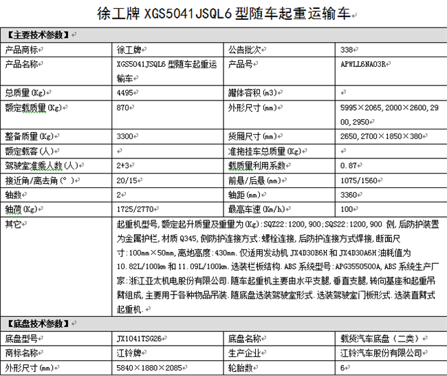 國(guó)六江鈴雙排藍(lán)牌隨車(chē)吊公告參數(shù):總質(zhì)量(Kg)4495,額定載質(zhì)量(Kg)870,整備質(zhì)量(Kg) 3300,外形尺寸(mm)5995×2065,2000×2600,2900,2950,貨廂尺寸(mm)2650,2700×1850×380,軸距(mm)3360,軸數(shù) 2。發(fā)動(dòng)機(jī)型號(hào)JX4D30B6H江鈴汽車(chē)股份有限公司