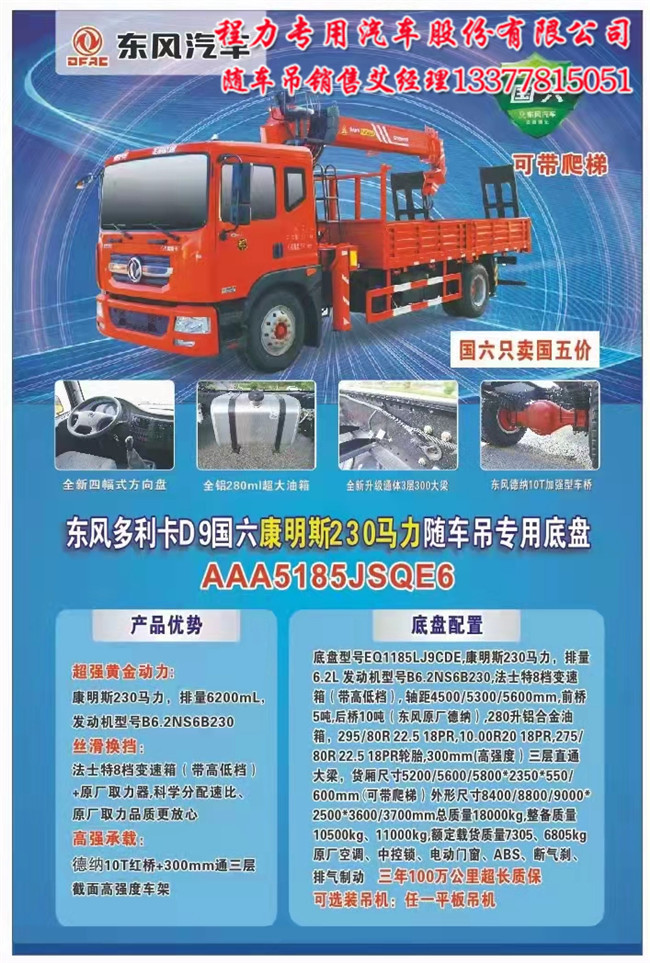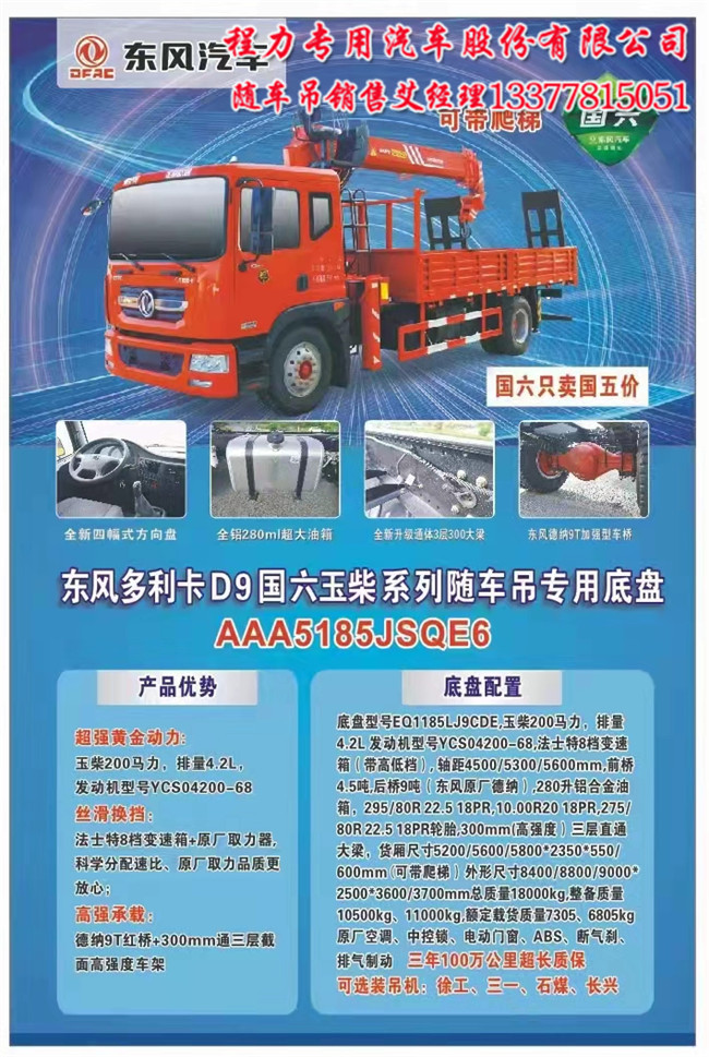 多利卡D9拉挖機隨車吊的車廂,車廂內(nèi)部尺寸5200mm,后面加一個爬梯(手動),拉挖機貨廂加厚加固(用方筒或槽鋼),1000R20輪胎,帶空調(diào)電動門窗,ABS,斷氣剎,排氣制動,法士特8檔變速箱,德納后橋。