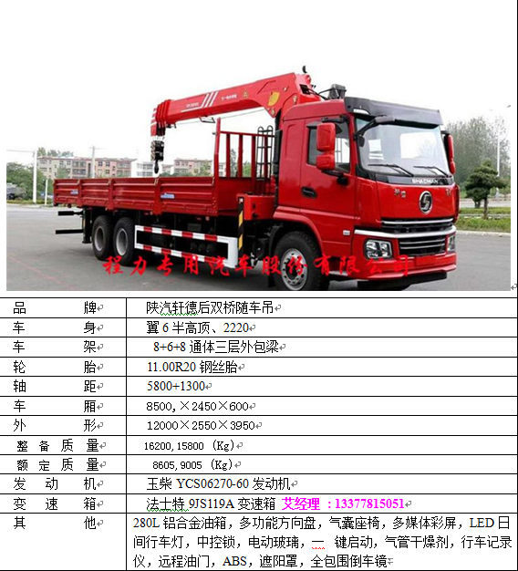 國六陜汽12噸后雙橋隨車吊軒德翼6駕駛室,四點懸浮,橋速比為5.143,11.00R20鋼絲胎,玉柴YCS06270-60發(fā)動機,法士特9JS119A手動變速箱,漢德 5噸級前橋,后橋采用的是漢德153B后橋,后300通三層大梁,280L鋁合金油箱,中控鎖,電動玻璃,一鍵啟動,氣管干燥劑,行車記錄儀,遠程油門,ABS,遮陽罩,全包圍倒車鏡。多功能方向盤,氣囊座椅,多媒體彩屏,LED日間行車燈,