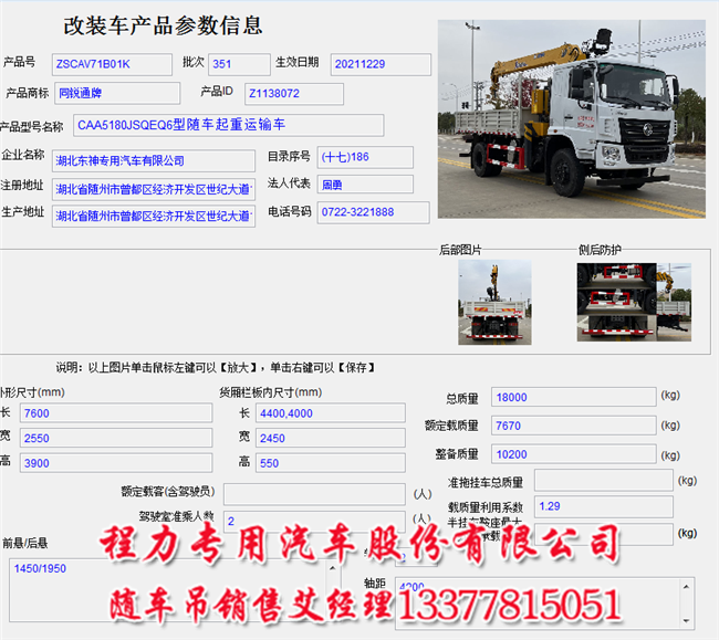 7噸東風(fēng)四驅(qū)隨車(chē)吊/6.3噸四驅(qū)隨車(chē)吊其它:側(cè)面防護(hù)螺栓連接在大梁上,后部防護(hù)焊接連接在大梁上,后下部防護(hù)裝置的截面尺寸為120×60mm,離地高度為500mm,ABS的型號(hào):3631010-C2000,生產(chǎn)廠(chǎng)家:東科克諾爾商用車(chē)制動(dòng)系統(tǒng)(十堰)有限公司;發(fā)動(dòng)機(jī)/油耗值(L/100km)對(duì)應(yīng)關(guān)系為: B6.2NS6B230/25.25(L/100km).安裝有具有衛(wèi)星定位功能的行駛記錄儀,選裝ETC.該車(chē)的專(zhuān)用功能及裝置:貨箱和吊機(jī),用于貨物的起吊和托運(yùn);吊機(jī)型號(hào)/最大起升載荷(kg)/吊機(jī)質(zhì)量(kg)為:SQS175/7000/2340;側(cè)面及后下部防護(hù)裝置所用材料的材質(zhì)為:Q235,連接方式為: