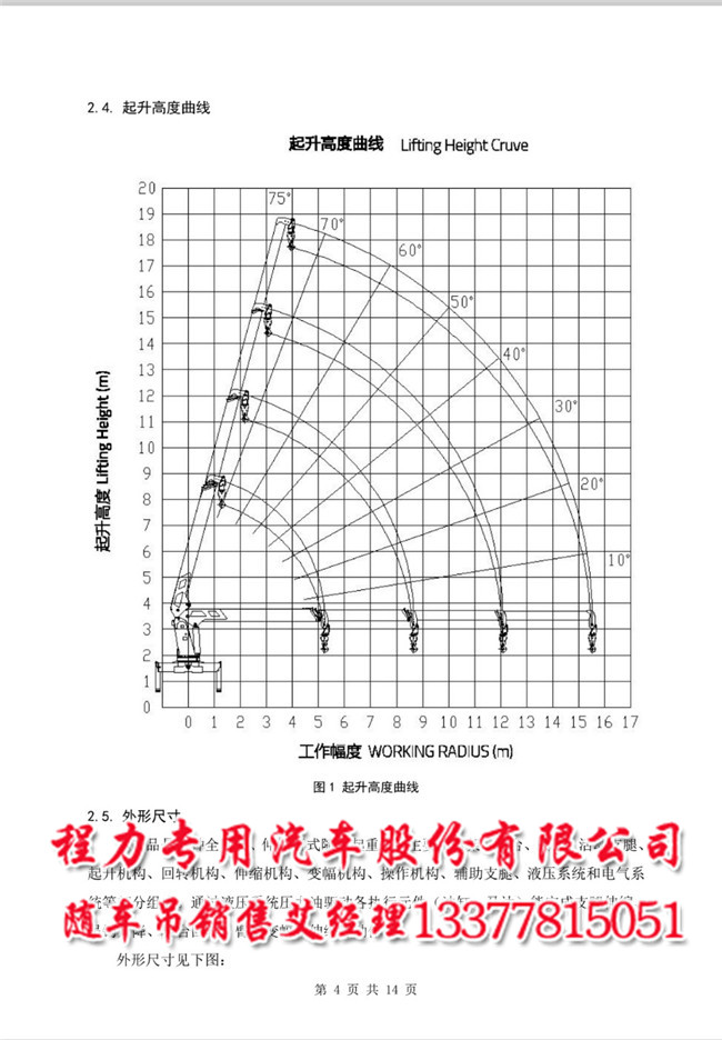 12噸中聯(lián)重科吊機(jī)參數(shù)12噸中聯(lián)隨車(chē)吊配后雙橋隨車(chē)吊及前四后八隨車(chē)吊和單橋車(chē),中聯(lián)重科吊機(jī)起升高度曲線起升高度曲線 Lifting Height Cruve 01234567891011121314151617工作幅度 wORKING RADIUS ( m )圖1起升高度曲線2.5.外形尺寸本產(chǎn)品是一種全回轉(zhuǎn)、伸縮臂式隨車(chē)起重機(jī),主要由臂架、轉(zhuǎn)臺(tái)、底架、活動(dòng)支腿、起升機(jī)構(gòu)、回轉(zhuǎn)機(jī)構(gòu)、伸縮機(jī)構(gòu)、變幅機(jī)構(gòu)、操作機(jī)構(gòu)、輔助支腿、液壓系統(tǒng)和電氣系統(tǒng)等部分組成。通過(guò)液壓系統(tǒng)壓力油驅(qū)動(dòng)各執(zhí)行元件(油缸、馬達(dá))能完成支腿伸縮、吊鉤升降、轉(zhuǎn)臺(tái)回轉(zhuǎn)、臂架變幅和伸縮等動(dòng)作。外形尺寸見(jiàn)下圖: