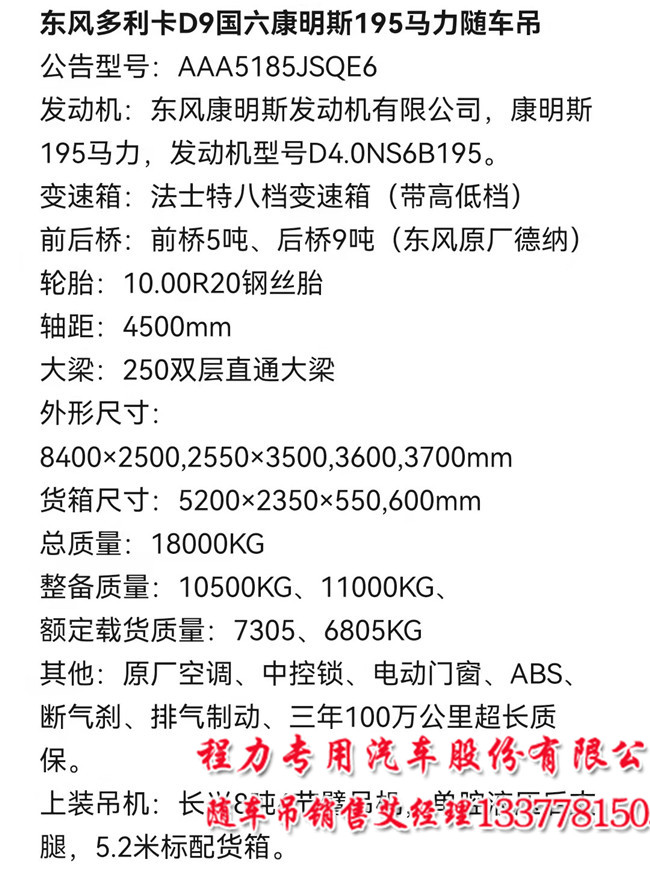二看多利卡D9隨車吊4.5米短軸距配置:配8噸吊機(jī)不超重車型,195馬力康機(jī),5.2米車廂,全鋼絲胎,玉柴YCS04200-68,玉柴200馬力,法士特8JS75,斷氣剎,排氣制動(dòng)4500軸距,10.00R20輪胎, 4.5/10德納橋,250雙車架,空調(diào)電動(dòng)窗,ABS,配有兩發(fā)動(dòng)機(jī)。