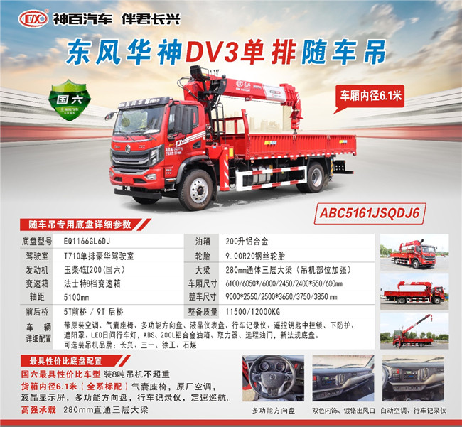 8噸五節(jié)單排DV3隨車吊東風(fēng)華神DV3單排隨車吊6米1貨廂 ,今天介紹又一款配8噸吊機(jī)車廂還能做到6米1華神DV3單排隨車吊,4X2東風(fēng)華神DV3單排隨車吊底盤;T710單排豪華駕駛室,液晶儀表盤,帶遮陽(yáng)板,原裝空調(diào)、氣囊座椅、法士特8檔變速箱,帶原廠取力器、原廠油門,9.00R20鋼絲胎,軸距5100,280mm直通三層大梁(吊機(jī)部位加強(qiáng)型),5T前橋/9T后橋,200L鋁合金油箱,多功能方向盤(定速巡航)、行駛記錄儀、電動(dòng)門窗,四合一遙控鑰匙,LED日間行車燈,玉柴200馬力。