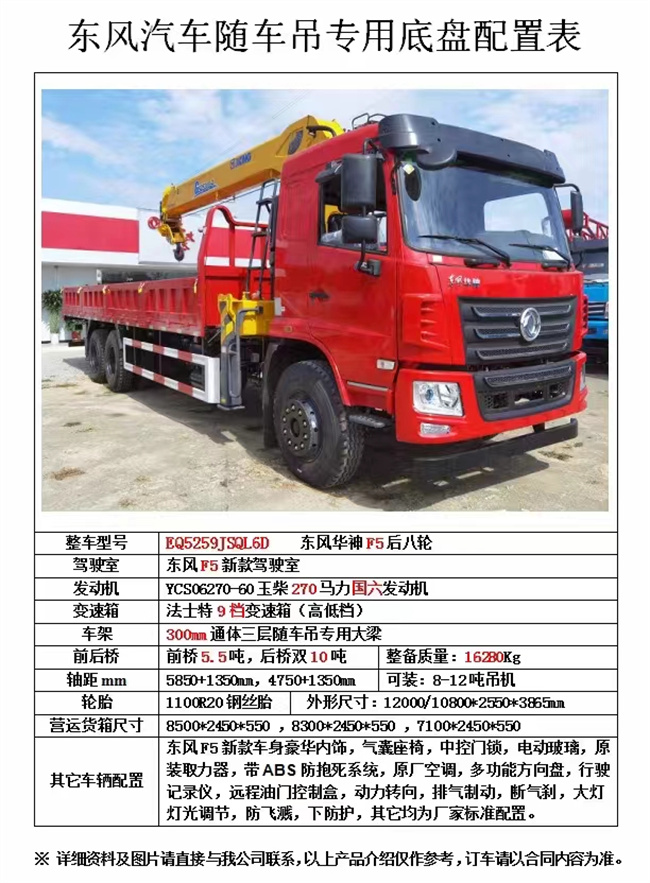東風(fēng)華神F5后雙橋隨車吊配置哪些事:D6.7NS6B320和YCS06270-60,駕駛室:D3豪華型;變速箱:法士特9檔;前后橋:10/13車橋;輪胎:11條1100鋼絲胎,標(biāo)配有:空調(diào),ABS,液晶屏,記錄儀,一鍵取停,遙控鎖等等。