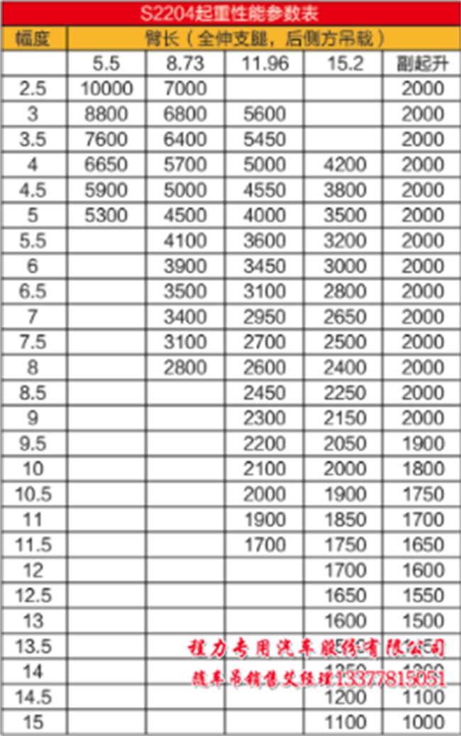 拉活動(dòng)房首選宏昌天馬10噸福田奧鈴隨車吊單排6.1米貨箱拉集裝箱, 10噸宏昌天馬10噸福田奧鈴隨車吊單排6.1米貨箱-宏昌天馬10噸S2204起重參數(shù)表,就是讓更多的用戶在選吊機(jī)時(shí)選多大吊機(jī)適合,在幾米之內(nèi)吊貨物重量,請(qǐng)看吊機(jī)細(xì)節(jié)參數(shù):在2.5米吊10噸;在3米吊8.8噸;在3.5米吊7.6噸;在4米吊6.7噸;在4.5米吊5.9噸;在5米吊5.3噸;在5.5米吊4.1噸;在6米吊3.9噸;在6.5米吊3.5噸;在7米吊3.4噸;在7.5米吊3.1噸;在8米吊2.8噸;在8.5米吊2.5噸;在9米吊2.3噸;在9.5米吊2.2噸;在10米吊2.1噸;在10.5米吊2噸;在11米吊4.9噸;在11.5米吊1.7噸;在12米吊1.7噸;在12.5米吊1.65噸;在13米吊1.6噸;在14米吊1.35噸;在15米吊1.1噸,大臂長(zhǎng)度為15米,高度為17米,用戶平時(shí)吊什么貨(確定貨物的長(zhǎng)度寬度及重量來(lái)選吊機(jī)車廂)。