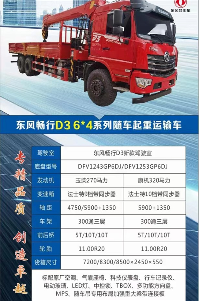 12噸短軸距暢行D3后八輪隨車(chē)吊7.2米/8.3米貨廂后雙橋短軸距隨車(chē)吊可選,先說(shuō)說(shuō)為什么選后雙橋短軸距隨車(chē)吊,整車(chē)短(10米左右)好拐彎,主要用于工地及農(nóng)村路,后雙橋短軸距隨車(chē)吊保住了25噸總質(zhì)量及自重輕些,也可選320馬力與270馬力玉柴可選,路況不好時(shí),下雨天路不好駛時(shí),大馬力的優(yōu)點(diǎn)。