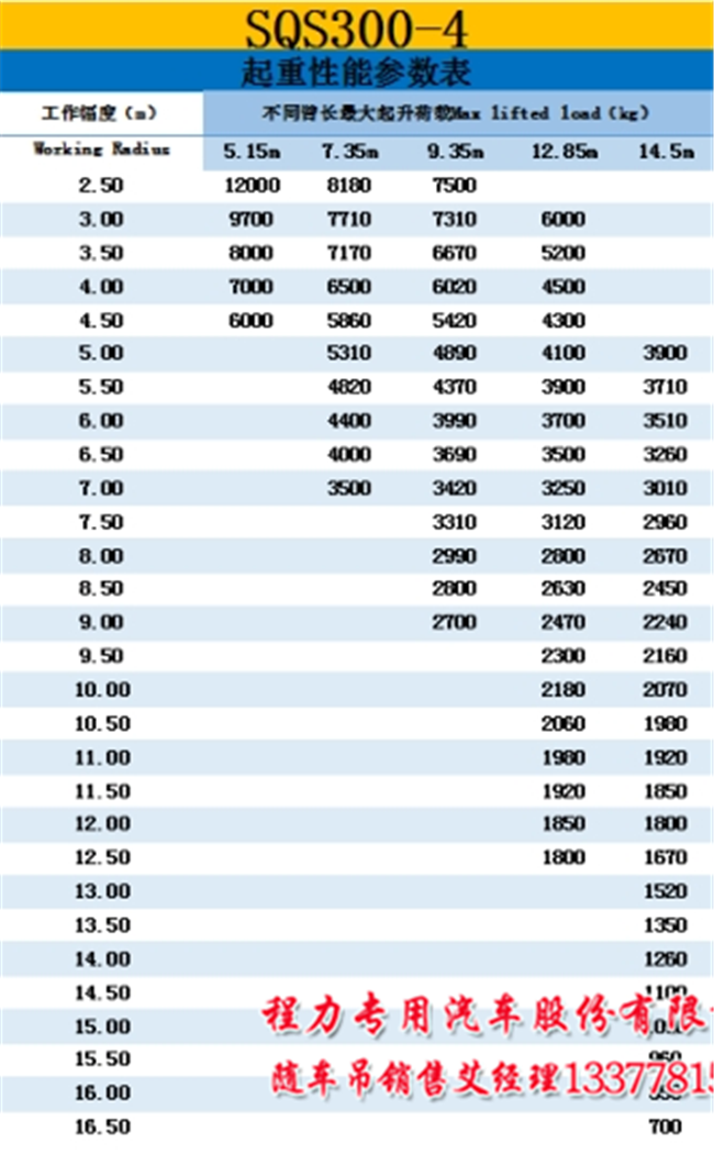 三看大力神后雙橋大力神12噸隨車吊吊機(jī)參數(shù)表:12T四節(jié)臂,吊機(jī)額定吊載質(zhì)量(Kg):12000,額定起重(T.m)30,最大工作幅度(m):13.5,最大起升高度(以支腿全伸地面為基準(zhǔn))(m):15.5米起重臂基本臂長(m):5.0 ,起重臂全伸臂長(m):13.5 起重臂節(jié)數(shù): 4 ,基本臂截面形式:六邊形 ,回轉(zhuǎn)角度(°):360 ,支腿跨度(全縮/全伸)(m): 2.4/5.7 ,推薦系統(tǒng)流量(L/min):72,系統(tǒng)額定壓力(Mpa): 26 ,操作方式:上位操作 ,工作半徑-最大起吊質(zhì)量,三看都看明白了,購車就放心了。
