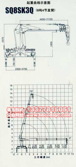 8噸吊機(jī)的參數(shù): SQ8Z3Q噸四節(jié)折臂吊機(jī)(舉升高度13米 ,工作半徑9.86米) 最大起重量是8T,最小起重量是1.25噸 SQ8SK3Q噸四節(jié)直臂吊機(jī)(舉升高度13.5米 ,工作半徑11.5米) 最大起重量是8T,最小起重量是1.1噸