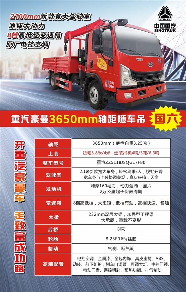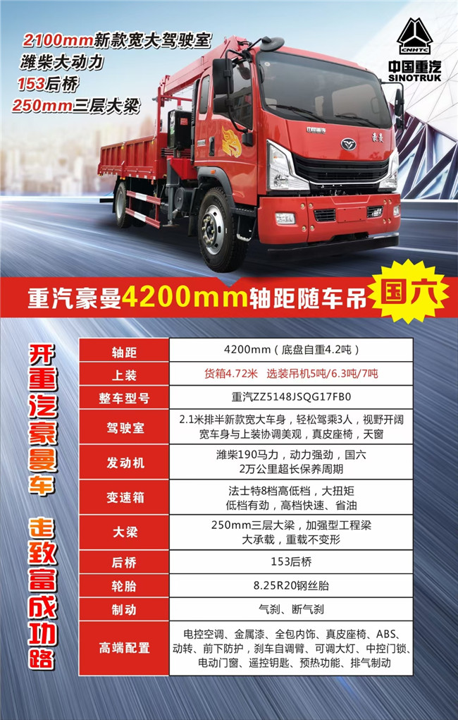 五款精品豪曼隨車吊配置:車廂,發(fā)動機,大梁,變速箱,前后橋一一介紹在圖片上。