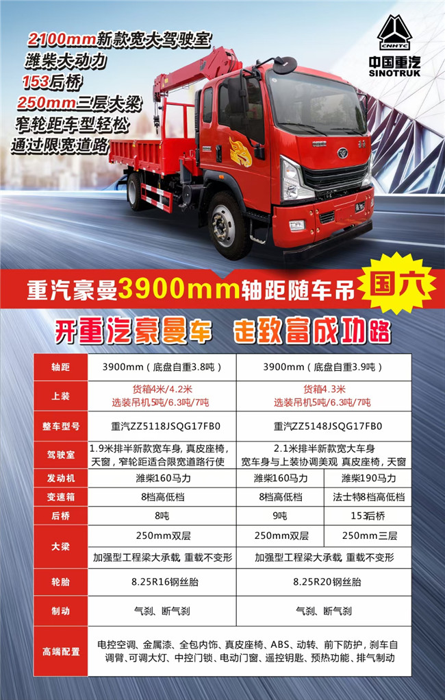 五款豪曼隨車吊3.2噸4噸5噸6.3噸7噸8噸吊機可配,國六發(fā)動機160馬力和190馬力濰柴,這幾款都適合鄉(xiāng)村公路,用于農(nóng)電改造,從3.28米軸距至4.5米軸距,吊機配3.2噸至8噸都可正常上牌。