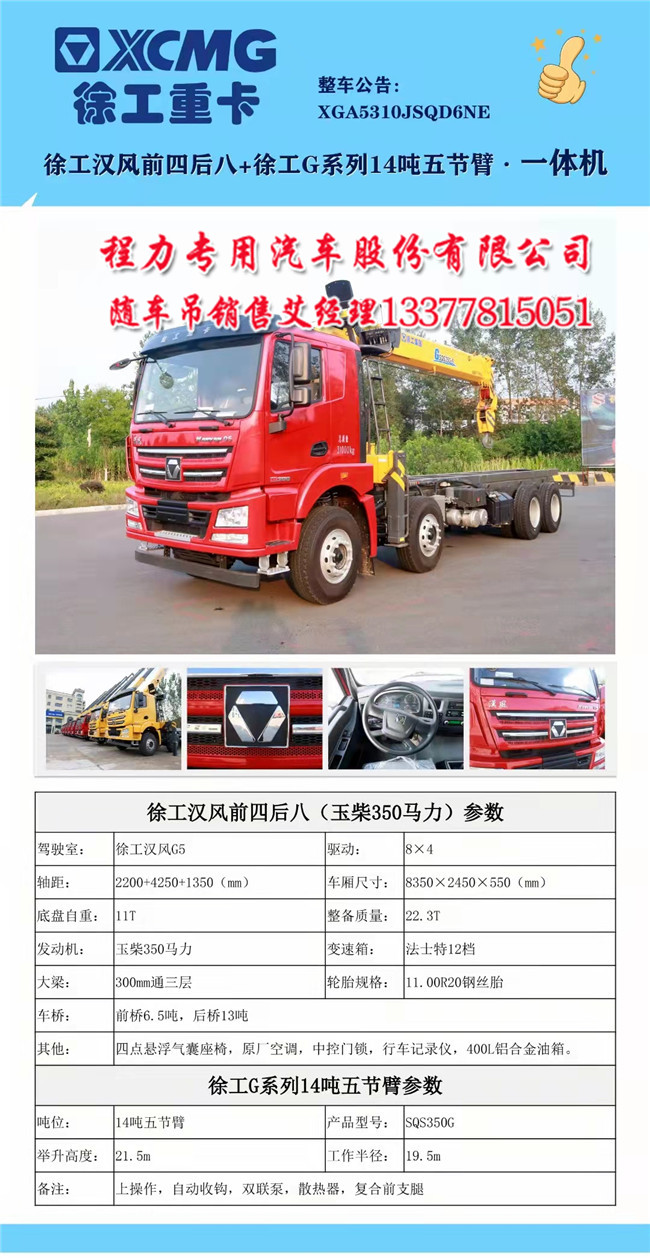 徐工漢風(fēng)前四后八隨車吊 8X4),原廠空調(diào),中控門鎖,行車記錄儀,玉柴350馬力,法士特12檔變速箱,前橋6.5噸,后橋13噸,300mm通三層大梁,11.00R20鋼絲胎,400L鋁合金油箱。備注:底盤自重11T,整備質(zhì)量22.3T,車廂尺寸8350X2450X550)玉柴350馬力,徐工漢風(fēng)G5駕駛室,四點(diǎn)懸浮氣囊座椅,軸距2200+4250+1350,