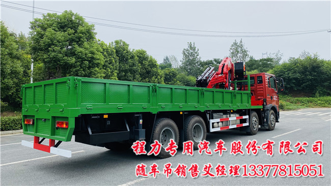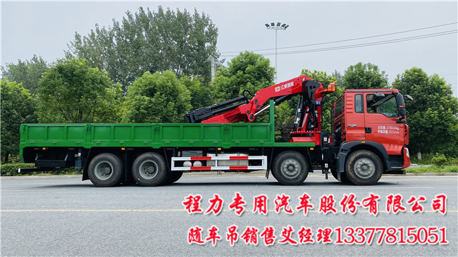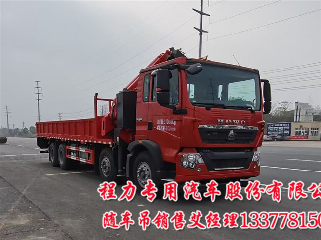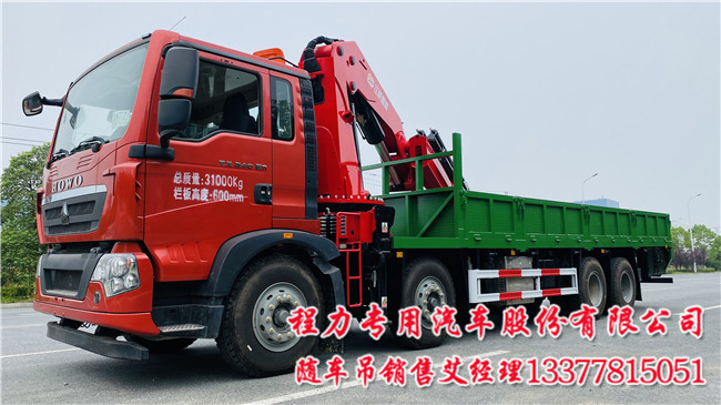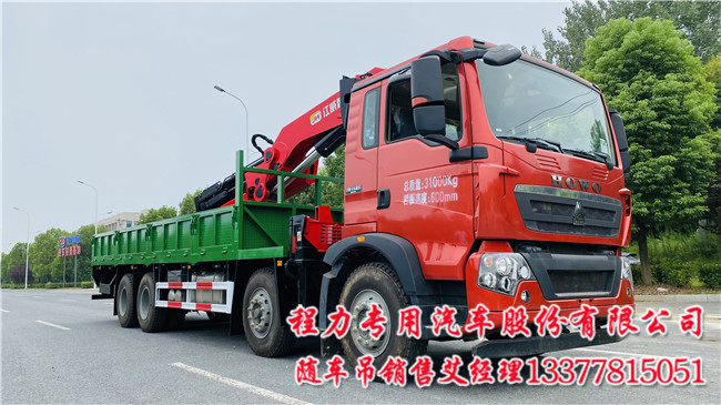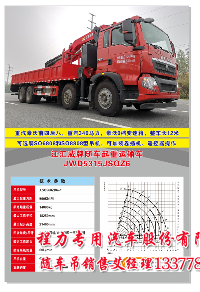 SQ560ZB6+1江威28噸重汽豪沃前四后八隨車吊:T5G駕駛室,軸距:2100+4350+1350德國曼340馬力發(fā)動(dòng)機(jī)/濰柴350馬力發(fā)動(dòng)機(jī),11.00R20鋼絲胎,6.5噸前雙/18噸雙后橋,9JSD150T-B變速箱+QH70法蘭式取力器;H653自調(diào)臂前軸(鼓);MCY12JGK自調(diào)臂雙后橋(鼓);速比4.63;雙層車架(8+5+10局部加強(qiáng)/300);11.00R20;400L油箱。整備質(zhì)量:23噸,車箱尺寸:8000*2450/2400*600/500/400。