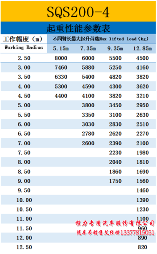 暢行D1單排大力神8噸隨車吊吊參表: