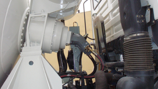 ※ 傳動(dòng)系統(tǒng) :該攪拌筒的驅(qū)動(dòng)方式為以發(fā)動(dòng)機(jī)為動(dòng)力源,由發(fā)動(dòng)機(jī)后端的取力器取力,通過傳動(dòng)軸傳遞到變量柱塞液壓泵,經(jīng)定量柱塞油馬達(dá),再通過減速機(jī)帶動(dòng)攪拌筒轉(zhuǎn)動(dòng)。