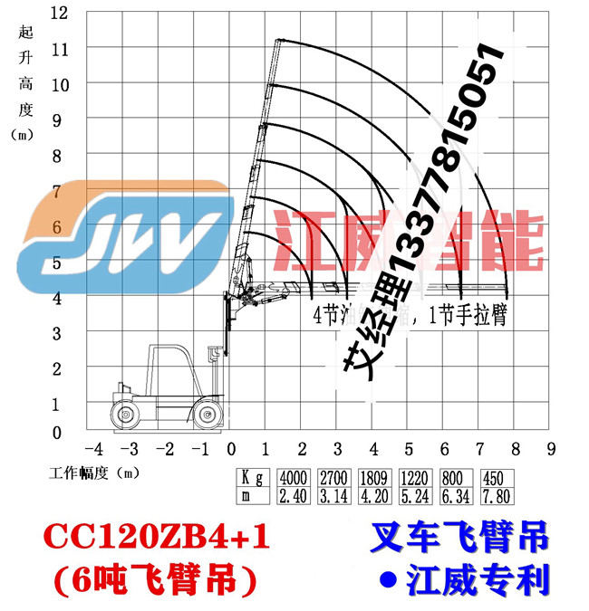 6噸叉車隨車吊:雙折臂叉車吊機,5節(jié)液壓,一節(jié)手拉,最大工作9米,全部升出可吊0.6噸,高度12米(按叉車升高3米算)。一變幅長度為2.5米。