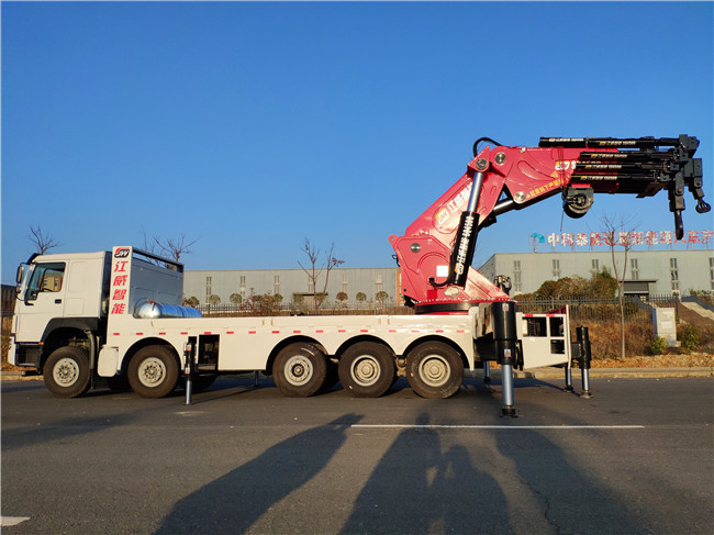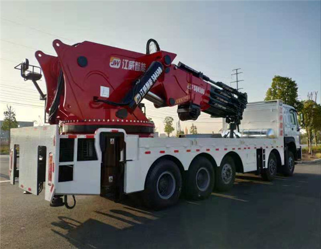 SQ4500江威隨車吊折臂吊機配重汽豪沃五軸底盤軸距1950+3075+1375+1350。豪沃380馬力發(fā)動機,后橋16噸,1200鋼絲胎,法士特12檔變速箱,總質(zhì)量50噸,整備質(zhì)量47.8噸。