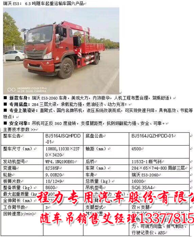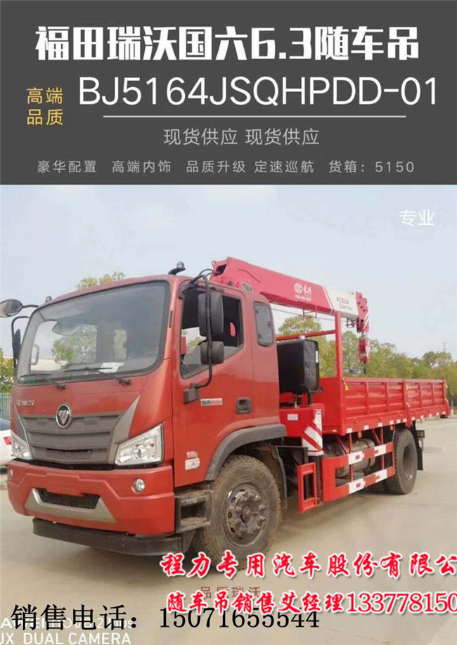 國六6.3噸福田瑞沃隨車吊價格8噸福田瑞沃隨車吊配置:   濰柴190馬力,法士特8檔,三層大梁 ,9噸后橋,ABS,電動玻璃門窗,中控.