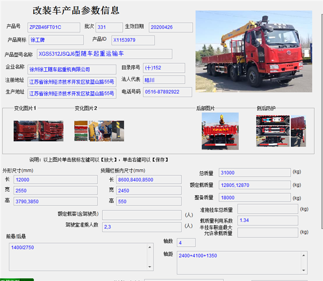 三一徐工吊14噸16噸20噸國(guó)六前四后八解放隨車吊參數(shù):