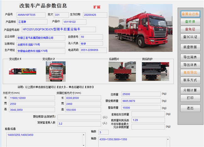 HFC5251JSQP3K3E43V12噸14噸后雙橋江淮隨車吊配置 :格爾發(fā)K6L半高頂駕駛室,法士特8檔變速箱(8JS105),前橋5t,后橋153,302×80×(8+4)車架,11.00R20 16PR輪胎,300L鐵油箱。5800+1350,12000×2550×3850.玉柴  YC6JA240-50.