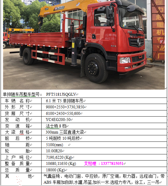 8噸程力專汽_單橋_6.1米T5隨車吊配置:程力專汽8噸配東風(fēng)T5質(zhì)尊版單排隨車吊,玉柴200馬力,法士特8檔變速箱,電動門窗,中控鎖,5噸前橋10噸后橋,原廠空調(diào),取力器,,10.00R20鋼絲胎,貨箱尺寸:6100*2450*550mm。300三層直通大梁,氣囊座椅,遠程油門,帶ABS